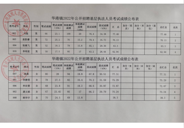 華港鎮(zhèn)2022年公開招聘基層執(zhí)法人員考試成績表