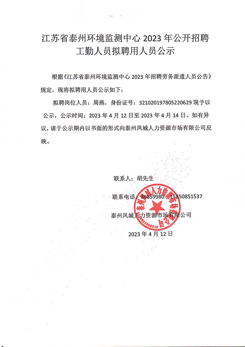 江蘇省泰州環(huán)境監(jiān)測(cè)中心2023年公開(kāi)招聘 工勤人員擬聘用人員公示