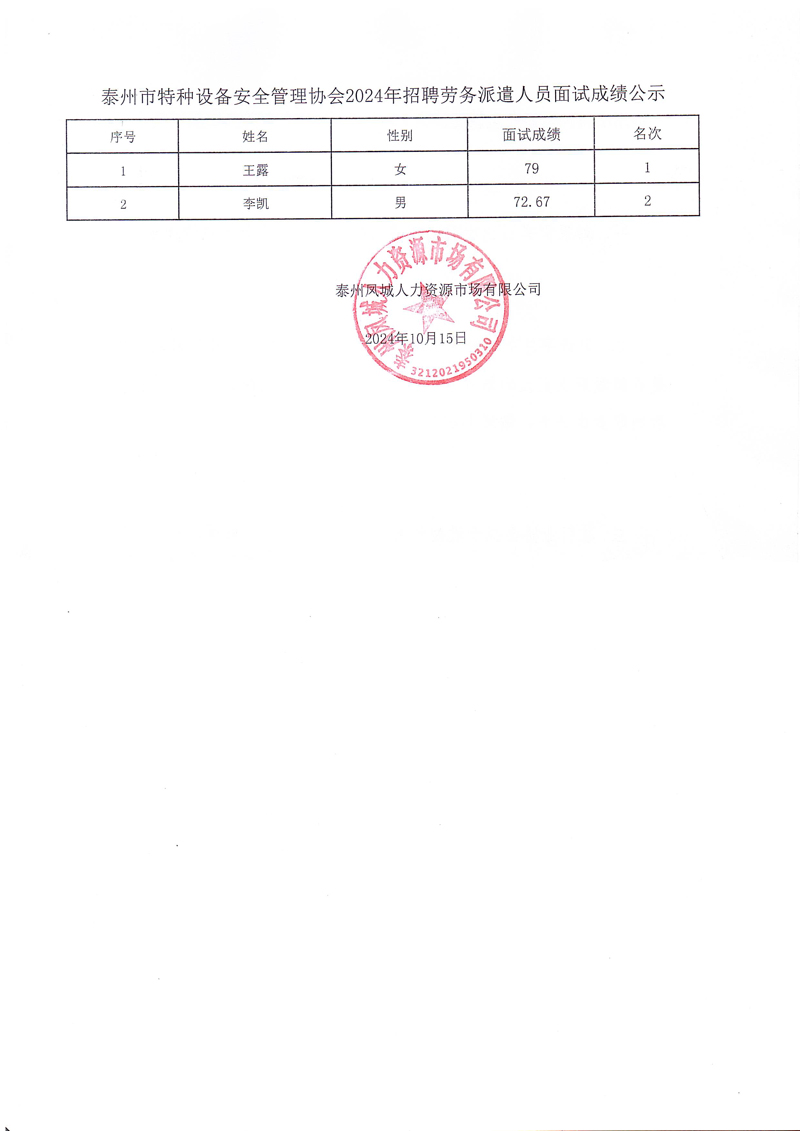 泰州市特種設備安全管理協(xié)會2024年招聘勞務派遣人員面試成績公示