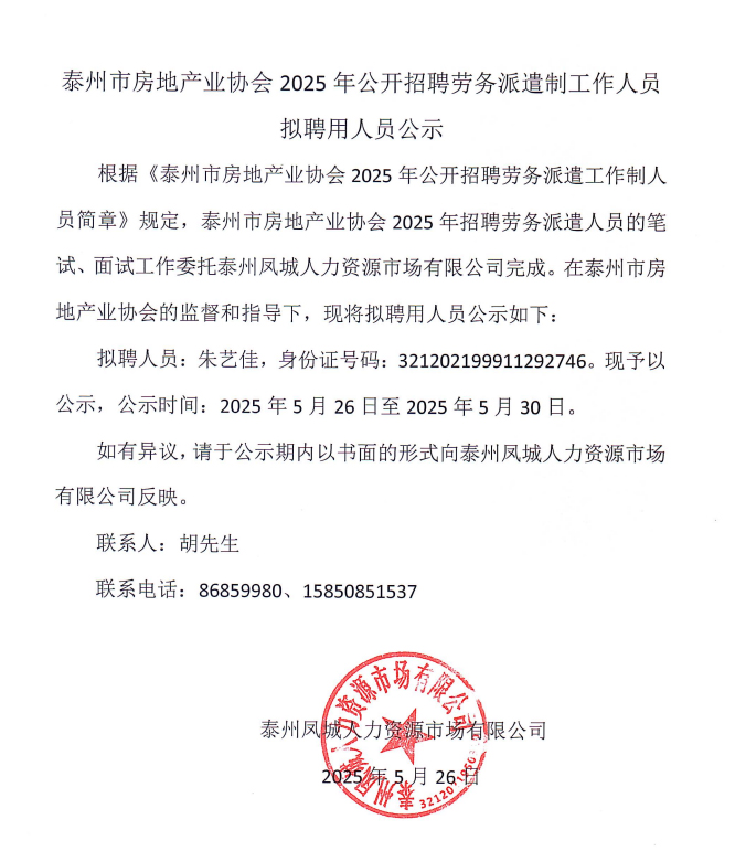 泰州市房地產(chǎn)業(yè)協(xié)會(huì)2025年公開招聘勞務(wù)派遣制工作人員 擬聘用人員公示